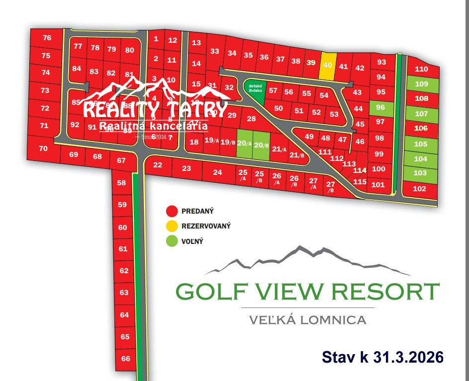 REALITY TATRY - realitná kancelária vám ponúka na predaj stavebné pozemky s kompletnými inžinierskymi sieťami - voda, plyn, elektrina, kanalizácia, kompletná asfaltová prístupová cesta s osvetlením. Pozemky sa nachádzajú v novej rekreačnej štvrti vo Veľkej Lomnici a sú situované na juhozápadnej časti kopca priamo nad golfovým ihriskom Black Stork. Unikátna orientácia ponúka jedinečné výhľady na panorámu Vysokých a Nízkych Tatier ako aj Slovenského raja. Lokalita je ohraničená zdola potokom a golfovým ihriskom a zvrchu lemovaná lesom.