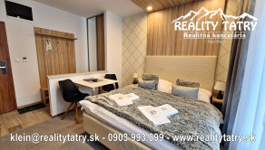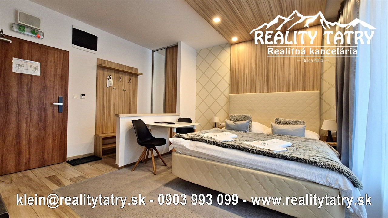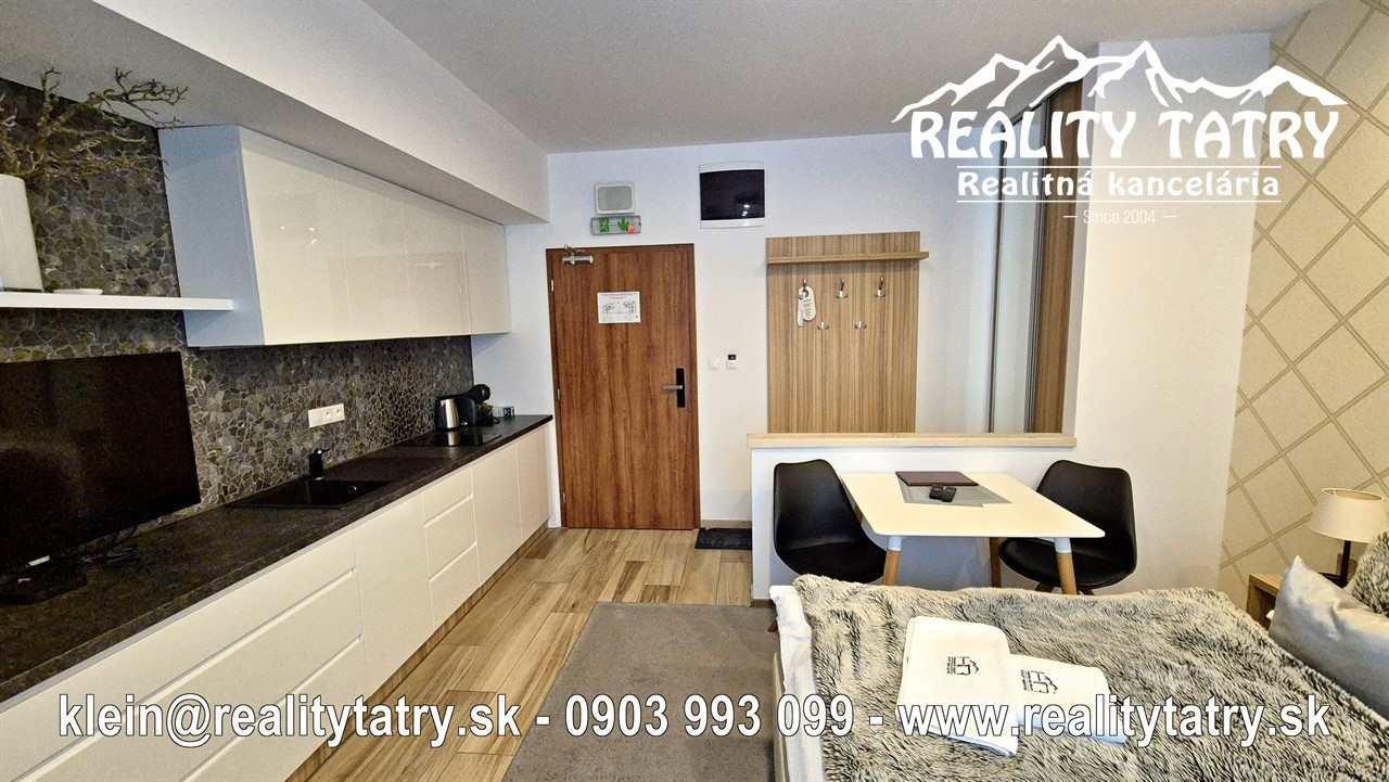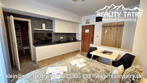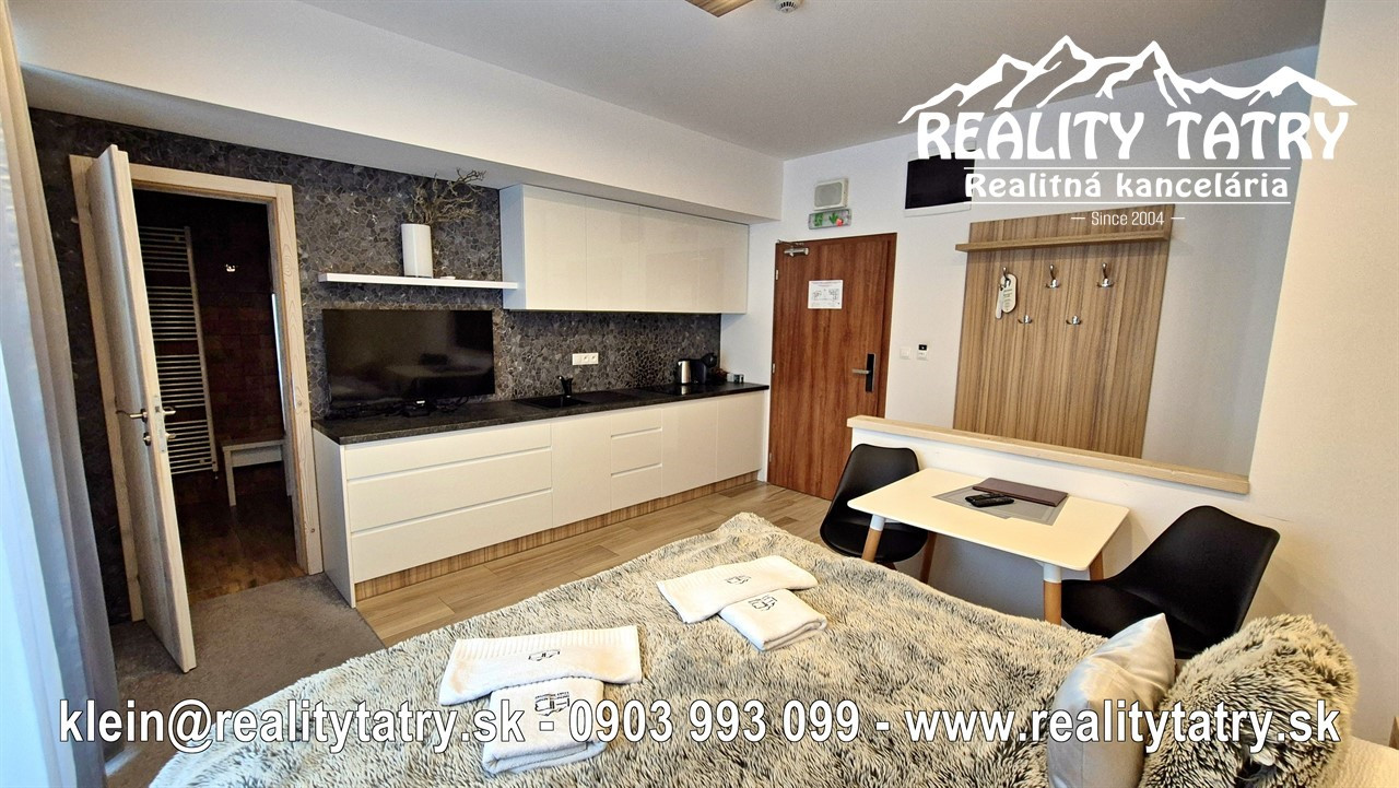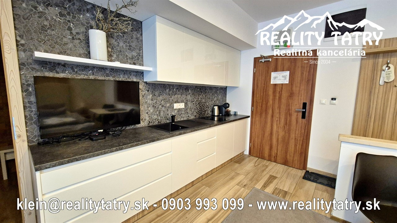 Exkluzívne vám ponúkame na predaj apartmán s terasou priamo v srdci Vysokých tatier - Starý Smokovec. Veľkosť apartmánu je 23 m2 + 6 m2 terasa. Apartmán sa nachádza v unikátnom komplexe HREBIENOK Rezort I. Komfortné bývanie v najvyššej kvalite a vybavenosti. Apartmán pozostáva z obývacej haly spolu s kuchynským kútom, Kúpeľne s WC a terasy. Kuchynská linka so zabudovanými elektrospotrebičmi: keramická varná doska, chladnička, elektrická teplovzdušná rúra. V kúpeľni sprchovací kút, toaleta a kúpeľňový nábytok na mieru. Apartmán je kompletne vybavený - vstavaná šatníková skriňa, dvoj-lôžková posteľ, TV, jedálenský stôl so stoličkami ... Apartmán sa predáva kompletne vybavený nábytkom, TV, WiFi, kuchynské potreby na varenie a stolovanie. Priamo v rezorte je možnosť využitia wellness, bazénu a posilňovne. Parkovanie je možné za zvýhodnený poplatok pred rezortom. Všetky letné a zimné aktivity v samotnej blízkosti rezortu cez lyžovanie, turistika, relax, bicyklovanie, golf a iné.